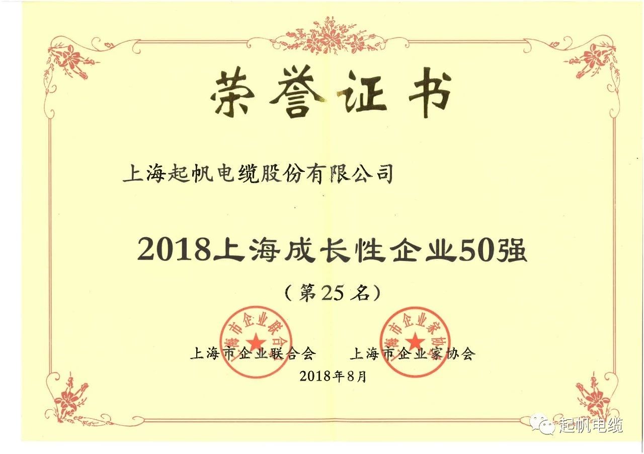 上海起帆电缆股份有限公司以雄厚的企业实力和优异的的市场表现,荣获“2018上海民营企业44名”、“2018上海制造企业39名”、“2018上海民营制造企业15名”、“2018上海成长性企业25名”。相比2017年,起帆公司的营业收入、净利润及排名都有大幅提高!